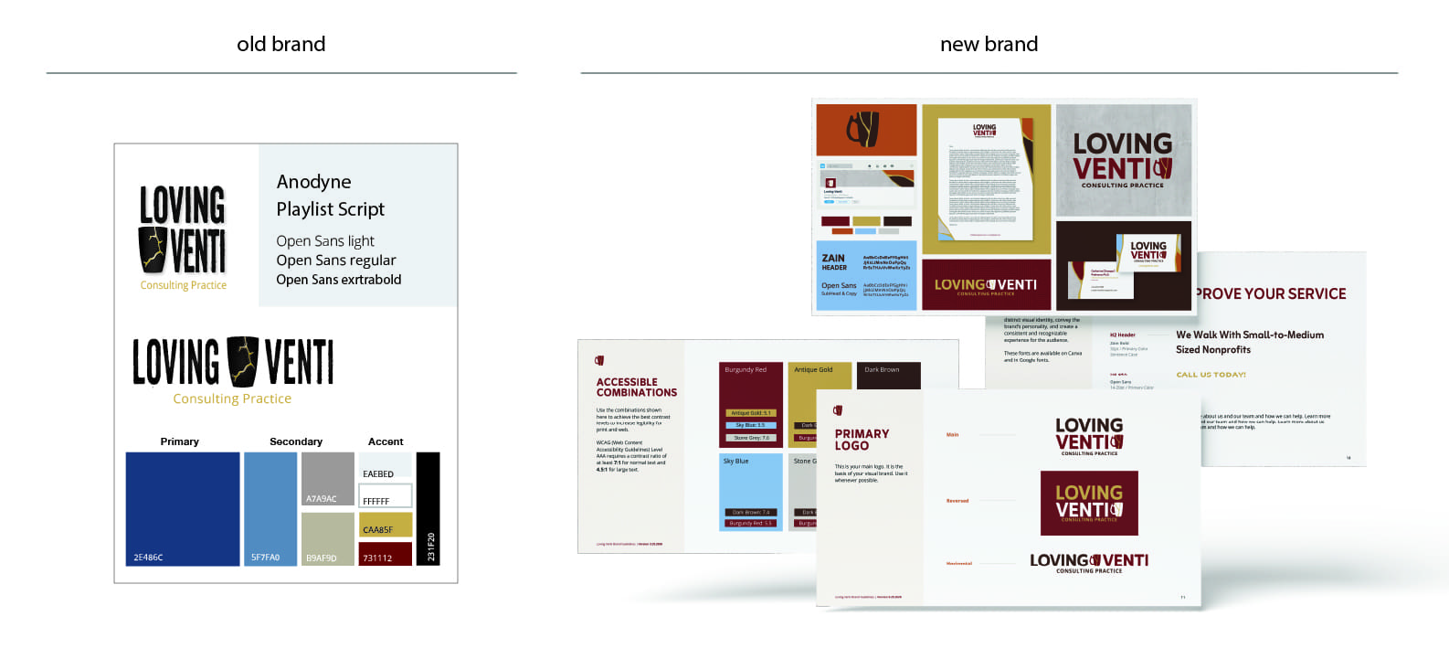 We recently completed this simple refresh for Loving Venti, a nonprofit consulting agency that helps fill the gaps in organizations so nonprofits can thrive. They had a polished brand foundation and just needed assets to help focus their vision and voice. We cleaned up their icon, fonts, and colors, and created patterns and textures for them too.